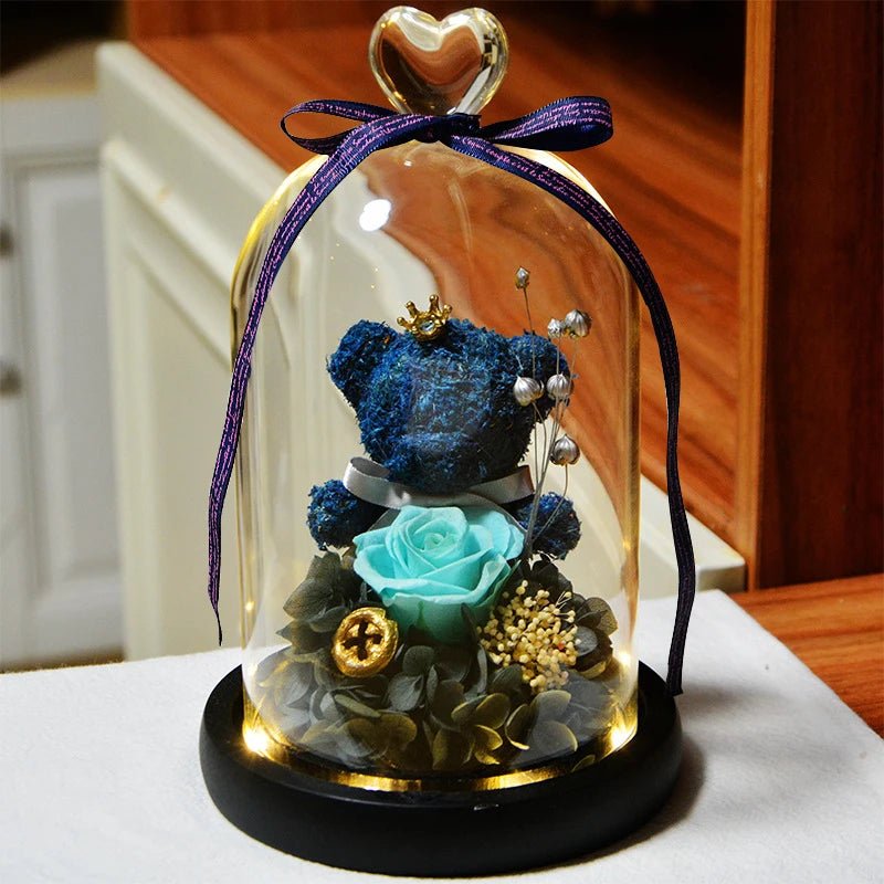 - Matériau : dôme en verre épais très transparent, peluche ourson, fleurs synthétiques, mousse éternelle, hortensia, ciel étoilé miniature