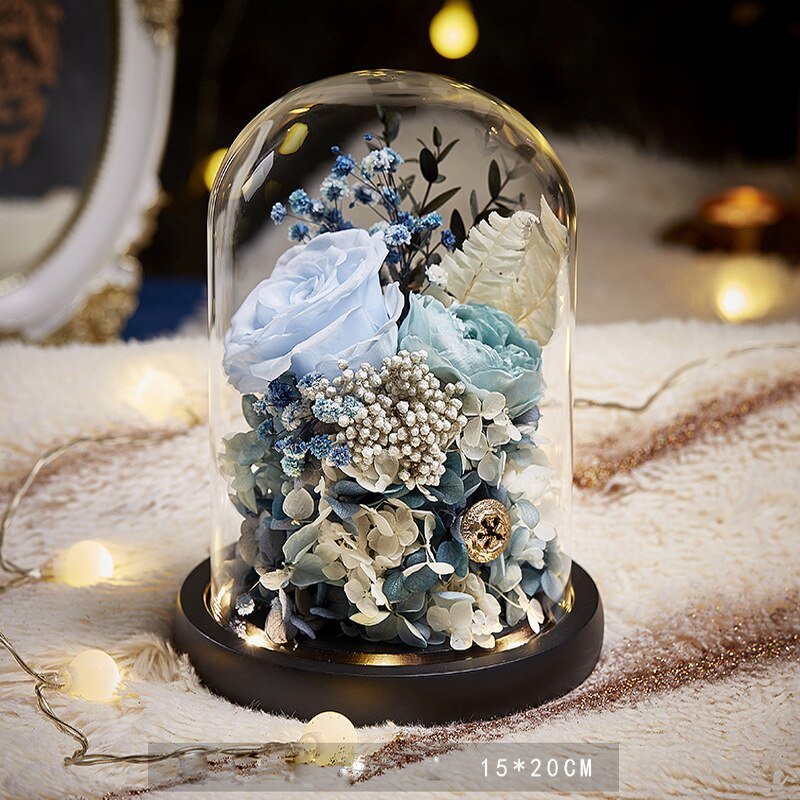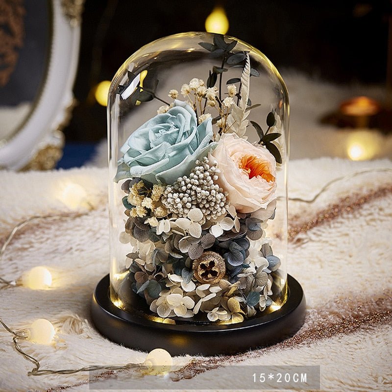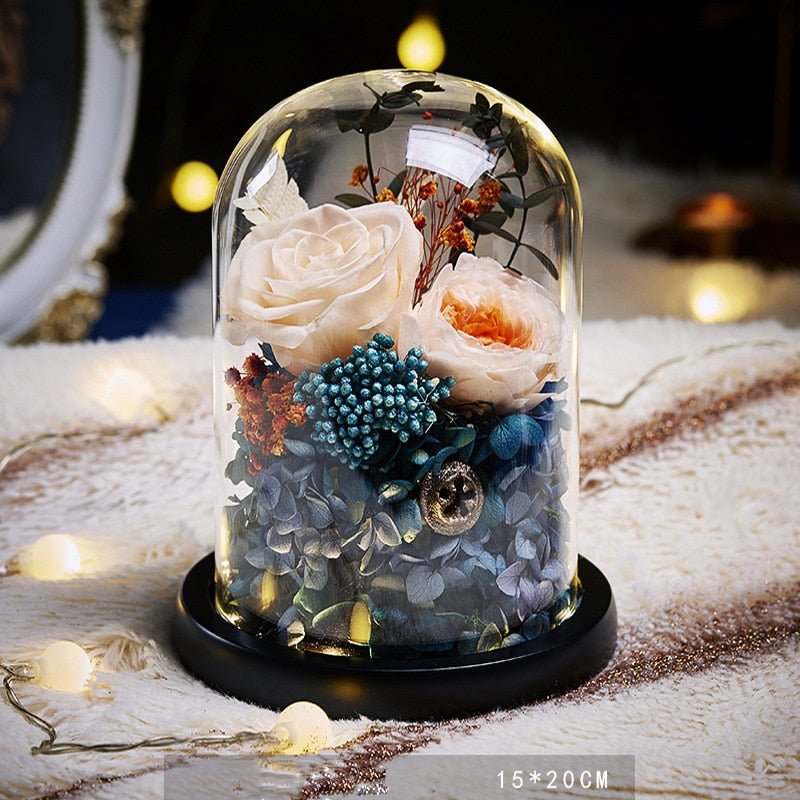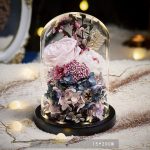 - Matériaux : Roses naturelles, décoration florale artificielle, cloche en verre