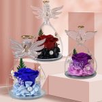 Adoptez notre splendide Rose Eternelle violette ! La cloche en verre, en forme d’ange, est ornée de détails dorés ajoutant une touche prestigieuse.